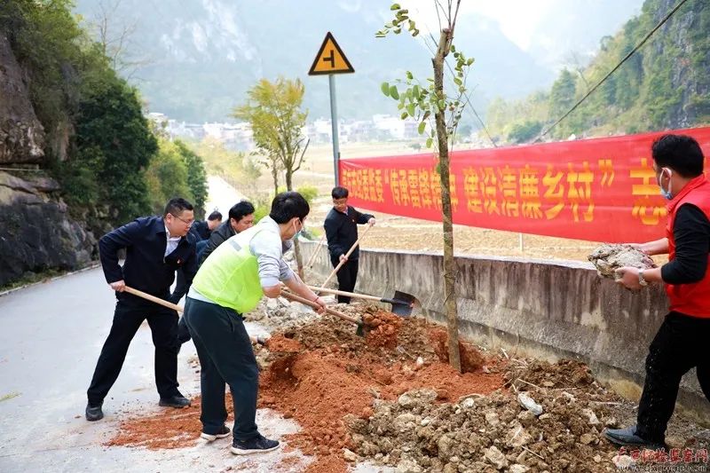 3月3日,崇左市天等县进结镇爱乐村委的道路两旁及篮球场两侧,新种下的10棵扁桃树、20棵宫粉紫荆、20棵蓝花楹、40棵球形三角梅正迎风挺立,这是崇左市纪委监委党员志愿者服务队与当地党员干部群众挥汗奋战一天的初步战果。
