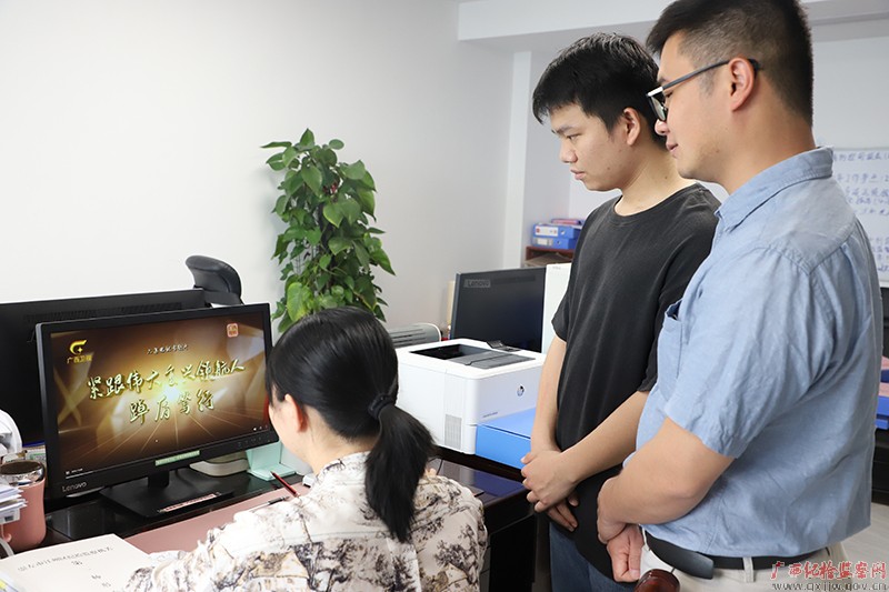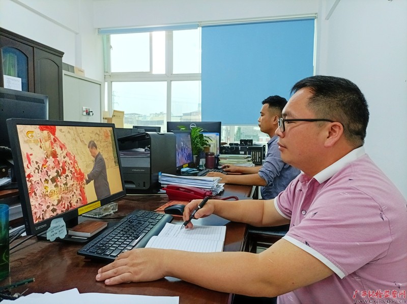 图为龙州县纪委监委干部在办公室观看电视专题片《紧跟伟大复兴领航人踔厉笃行》。大家表示要以更加饱满的热情投入到纪检监察工作当中,不断推动纪检监察工作高质量发展。(何年飞/摄)