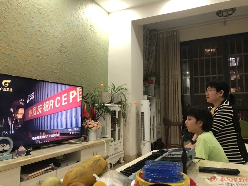 《紧跟伟大复兴领航人踔厉笃行》在各大平台同步播出后,大新县纪委监委党员干部及时收看,引发热烈反响。图为县纪委监委驻县市场监督管理局纪检监察组组长冯丽青和家人一同在家中收看专题片。(农丹妮/摄)