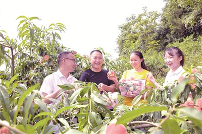 四川省古蔺县向重点村选派驻村工作队,让干部在乡村振兴一线服务群众、增长才干、施展抱负。图为县纪委监委驻村工作队队员在千亩“秋燕香桃”种植基地与果农一起采摘香桃。苏海鹏 摄