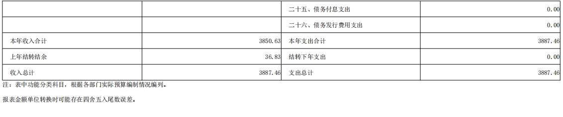 我部门总收入3887.46万元,总支出3887.46万元。总收入较2023年度预算数3975.10万元,减少87.64万元,下降2.20%,主要原因是根据过紧日子文件精神压减经费支出。总支出较2023年度预算数3975.10万元,减少87.64万元,下降2.20%,主要原因是根据过紧日子文件精神压减经费支出。