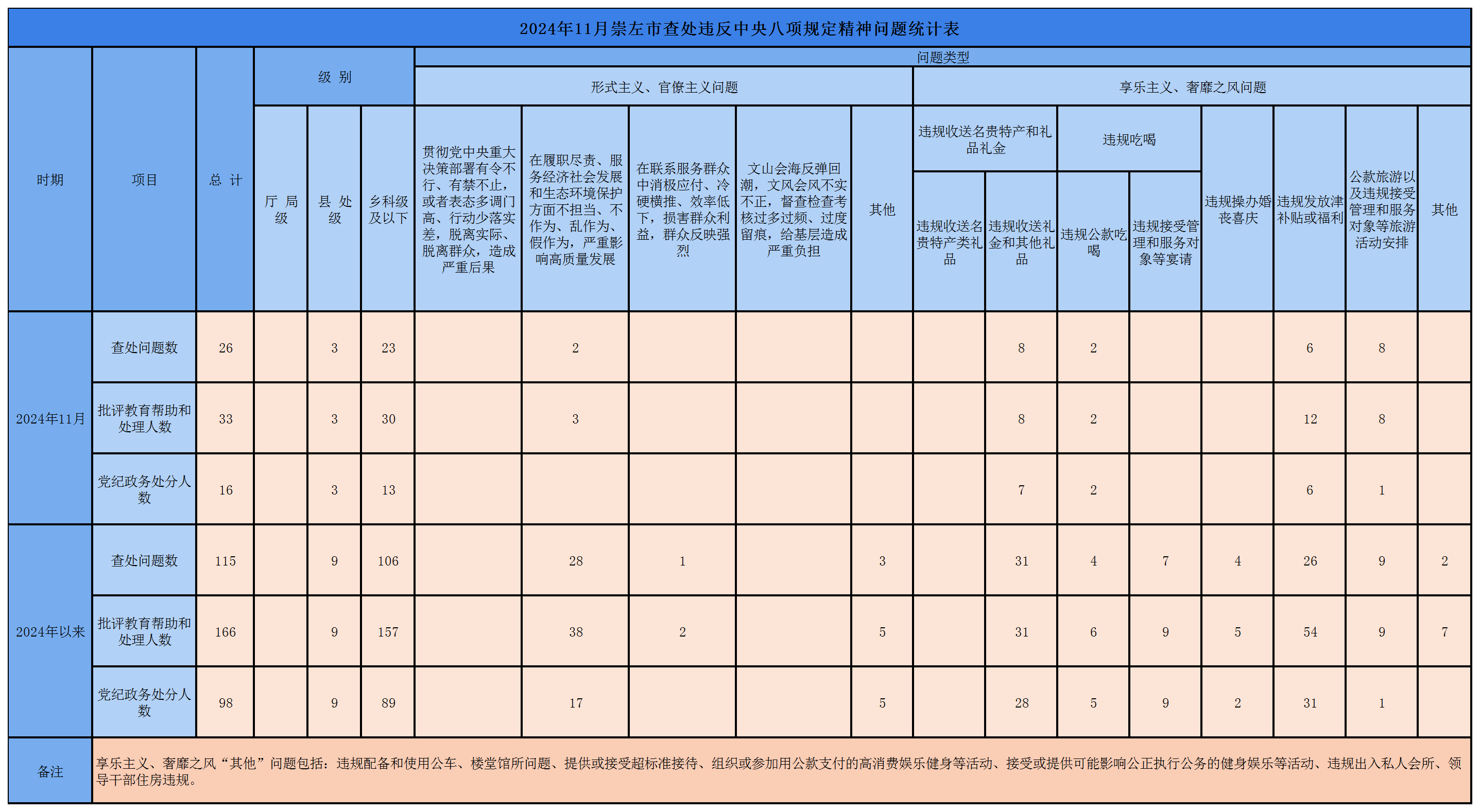 2024年11月崇左市查处违反中央八项规定精神问题26起