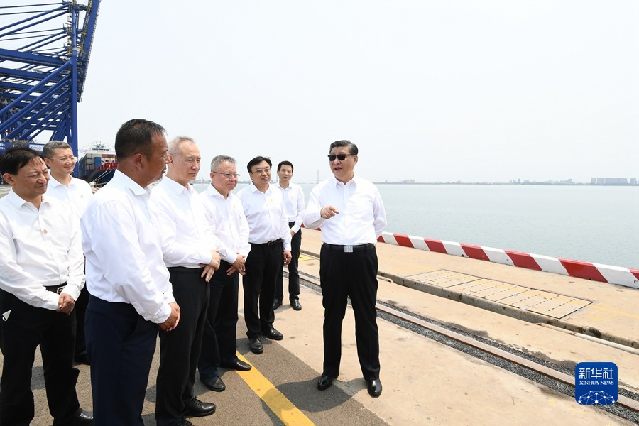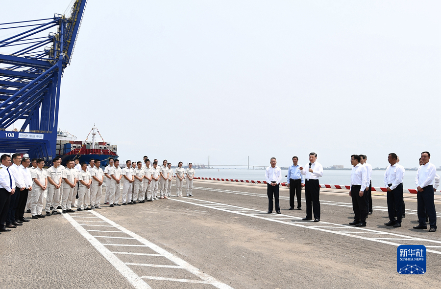 4月10日至13日,中共中央总书记、国家主席、中央军委主席习近平在海南考察。这是12日上午,习近平在洋浦国际集装箱码头小铲滩港区考察。新华社记者 谢环驰 摄