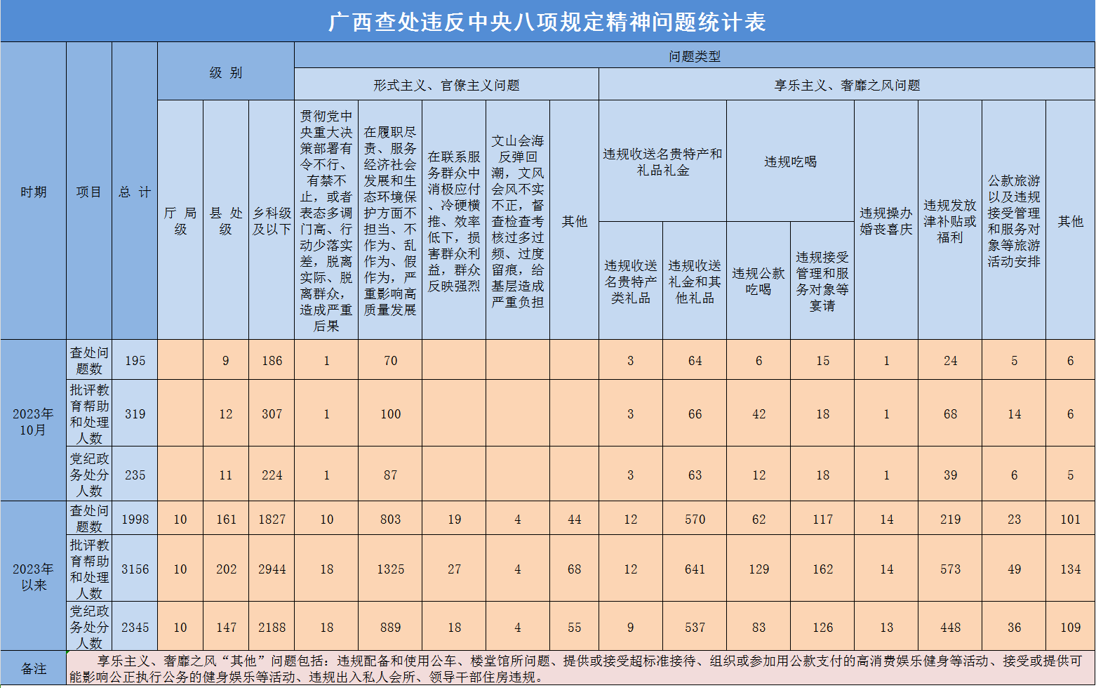 2023年10月广西查处违反中央八项规定精神问题195起