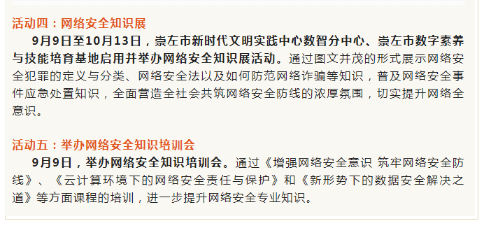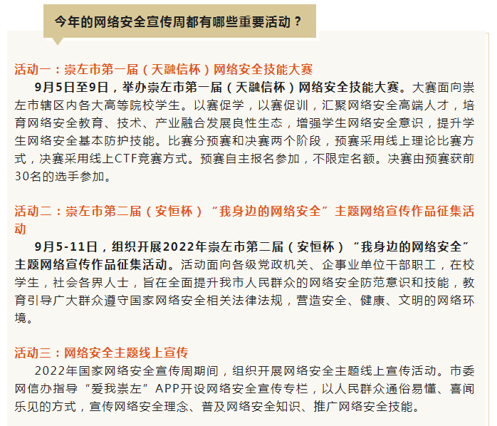 网络安全为人民,网络安全靠人民。2022年国家网络安全宣传周崇左市活动于9月5日至11日同步开展。活动将深入宣传贯彻习近平总书记关于网络强国的重要思想,宣传贯彻习近平总书记关于网络安全工作“四个坚持”重要指示,结合迎接党的二十大胜利召开的主题,围绕党的十八大以来网络安全领域取得的重大成就开展主题宣传活动,深入宣传网络安全领域重要法律法规、政策文件和国家标准,以高质量的内容供给、立体化的传播矩阵和精准化的群体投送,大力营造网络安全人人参与、人人有责、人人共享的浓厚氛围,有力推动全社会网络安全意识和防护技能提升。