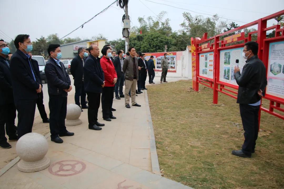 与会人员在听取明江镇洞廊村“大榕树课堂”廉政文化主题公园建设情况介绍