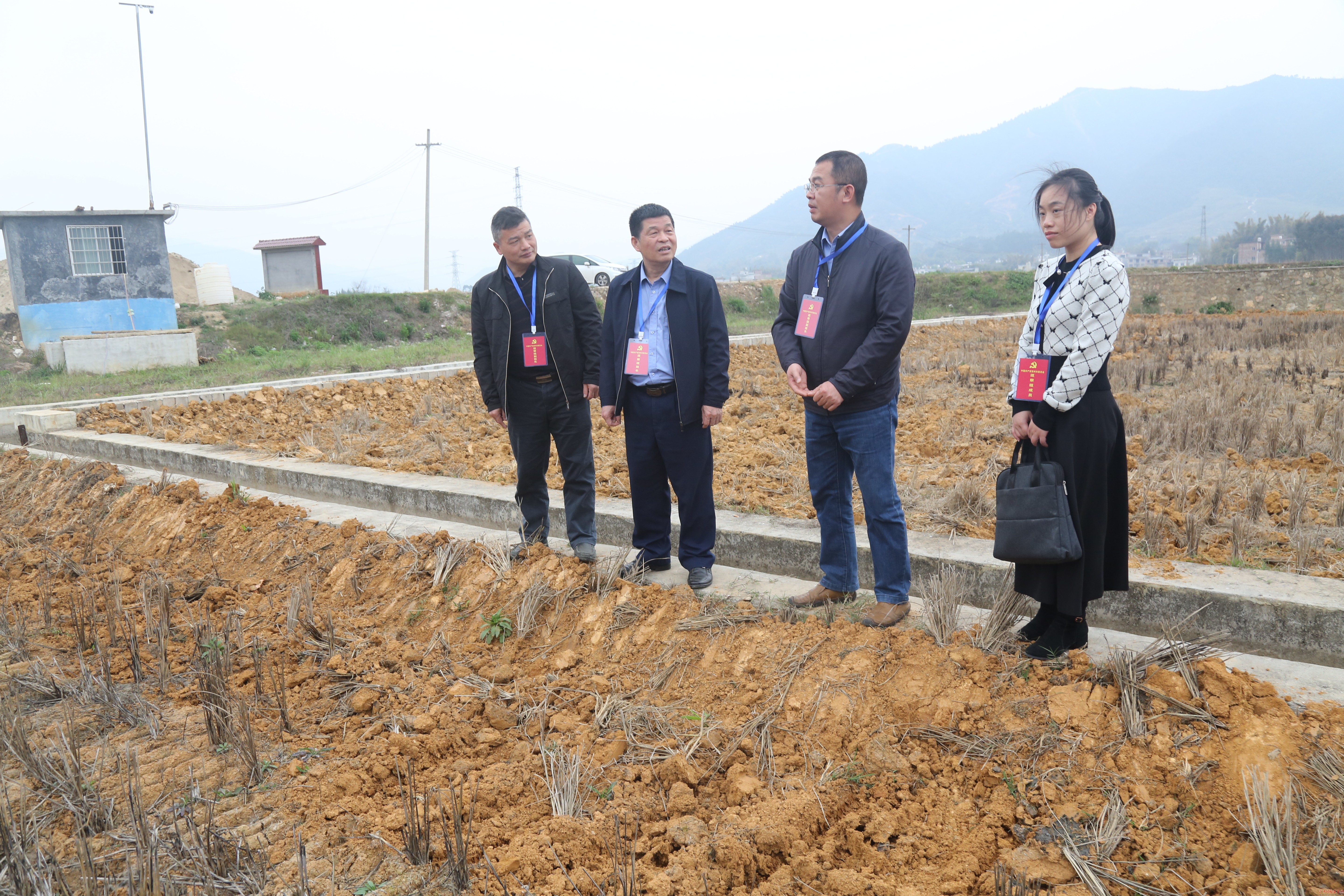 2023年3月10日,贝荣越(左二)和巡察组员到工矿废弃地复垦项目实地核查相关问题情况。(廖添慧/摄)